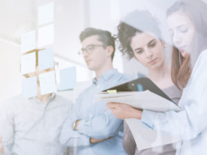 Young business team meeting in the office, working together and discussing ideas on sticky notes: business creative solutions and start-up concept
